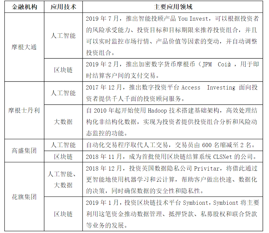 以摩根士丹利、摩根大通等為代表的國際一流投行,由于具備雄厚的資本實力和強大的技術能力等優(yōu)勢,積極探索數(shù)字技術在財富管理、支付與結算、數(shù)據(jù)分析、合規(guī)監(jiān)管、數(shù)字貨幣等領域的應用并取得積極成效。