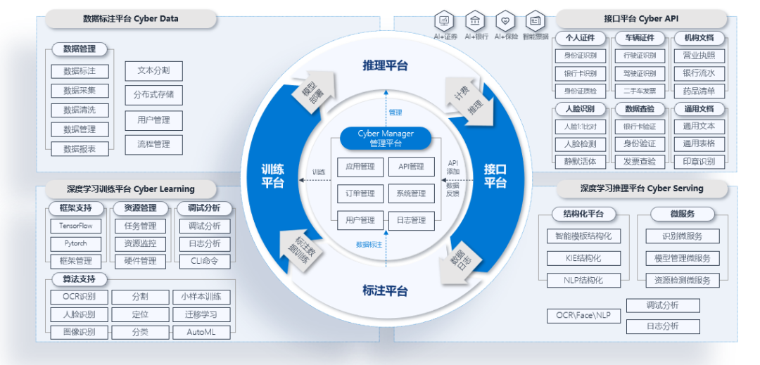 賽博學(xué)習(xí)平臺是易道博識基于深度學(xué)習(xí)自主研發(fā)的全棧式數(shù)據(jù)服務(wù)平臺,包含數(shù)據(jù)標(biāo)注平臺、訓(xùn)練平臺、推理平臺、接口平臺、管理平臺5大部分,涵蓋數(shù)據(jù)標(biāo)注,數(shù)據(jù)訓(xùn)練、推理服務(wù)三大數(shù)據(jù)服務(wù)環(huán)節(jié),可提供模型開放及模型訓(xùn)練的流水線定制化服務(wù)。