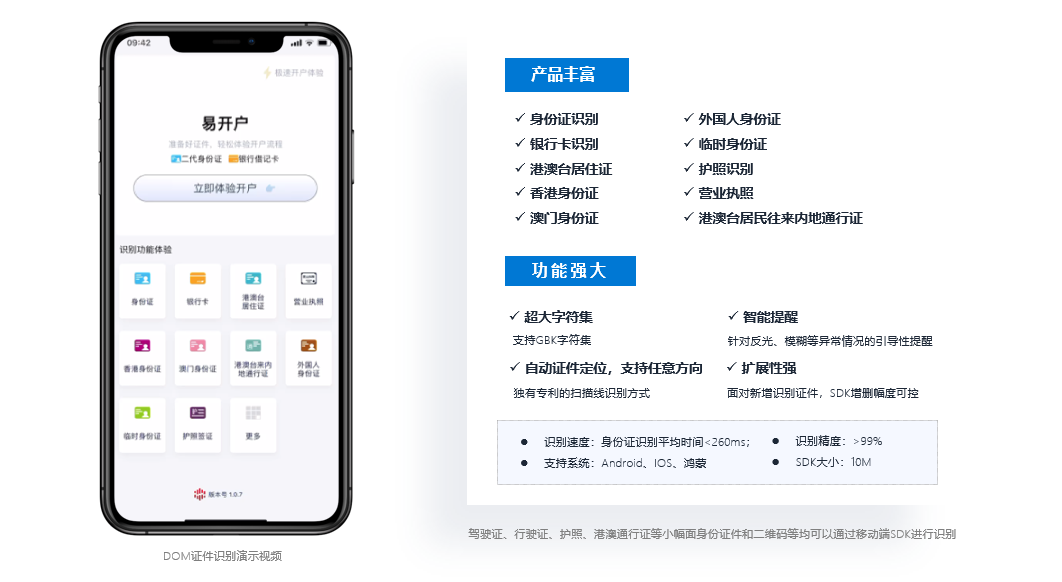 DOM SDK的市場需求非常大,證券開戶,銀行開戶,投保理賠,汽車金融……等大量應(yīng)用卡證識別,且移動端需求量極大的業(yè)務(wù),都是DOM SDK的應(yīng)用場景。這些場景對識別速度、識別精度的要求非常高,客戶容忍度低,注重用戶體驗,對產(chǎn)品的魯棒性要求很高。