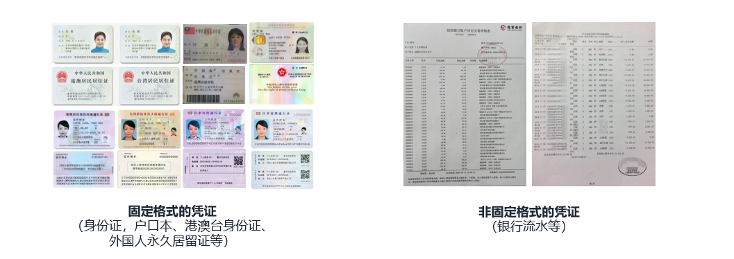 隨著金融業務的發展,越來越多的業務線中涉及的紙質憑證影像需要用到OCR自動處理,來進一步提升業務辦理的效率。從企業內部的數據類型來看,這些憑證影像按照格式可以分為兩類:一類是固定格式的憑證(戶口本、港澳臺身份證、外國人永久居留證等),占整體90%以上;一類是非固定格式的憑證(銀行流水等)。這些憑證存在以下特點: