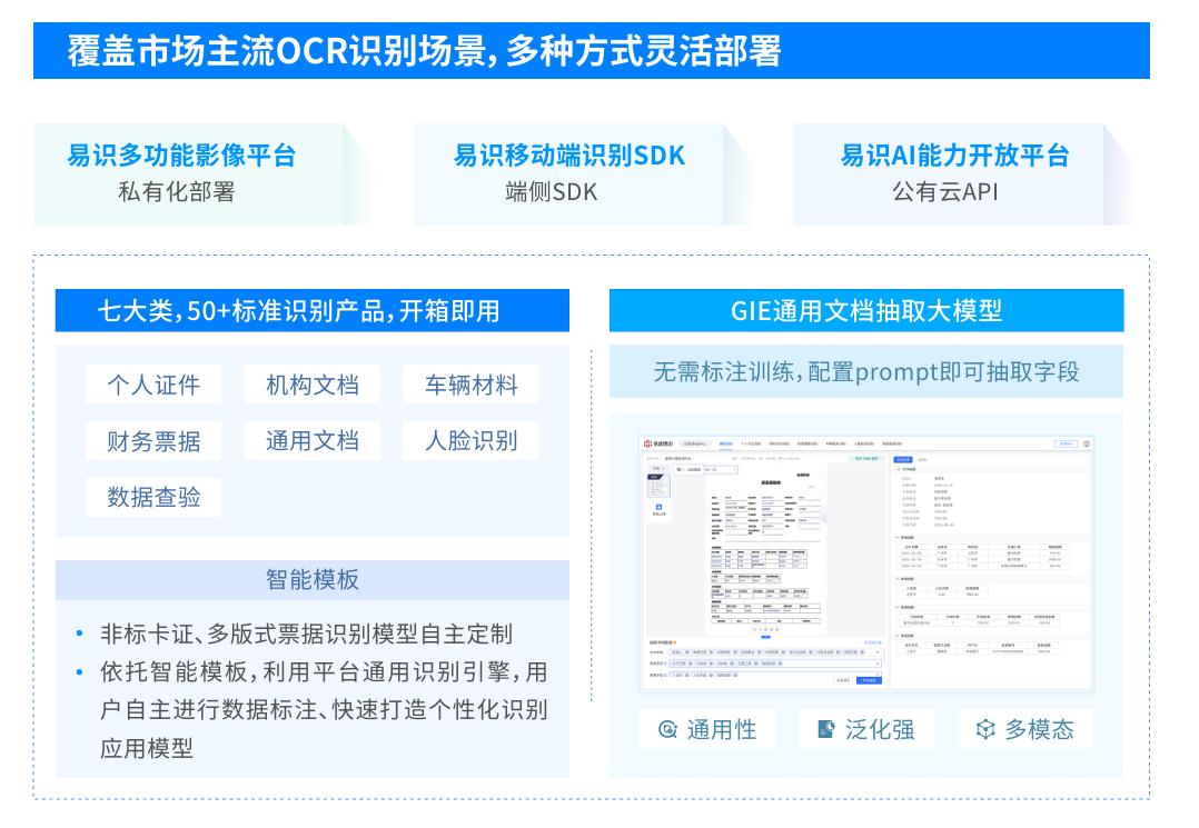 針對不同規模和需求的醫療機構,易道博識的“易識”產品線提供了定制化的解決方案,滿足了從大型醫院到中小型診所的多種需求。以“易識AI能力開放平臺”為例,該平臺支持多種票據和證件識別功能,并通過API接口使用戶能夠快速調用、輕松集成。這種云端支持方式對初期預算有限的機構尤為適用,不僅降低了部署門檻,還為后續的擴展提供了可能。而對于那些需要在移動端實現票據識別的場景,“易識移動端識別SDK”在提供高性能識別能力的同時,也保持了設備的輕量級運作,確保在移動環境下同樣能夠獲得高效、精準的識別效果。