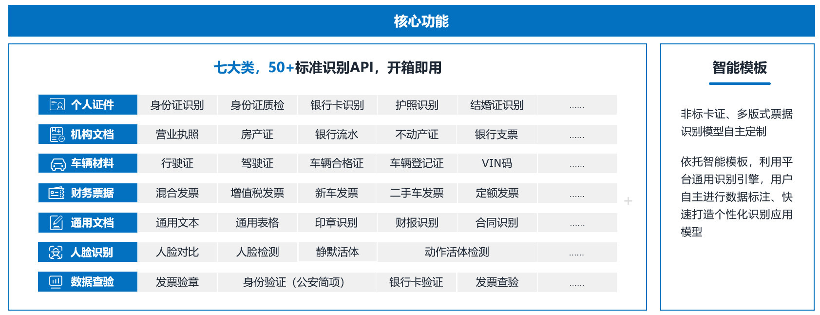 “易識”平臺的優勢不僅局限于身份證識別,它還涵蓋了包括卡證識別、財務票據處理、車輛相關識別、人臉活體檢測等在內的7大類、50多種識別產品。這種多功能性確保了平臺能夠滿足廣泛的業務識別需求。