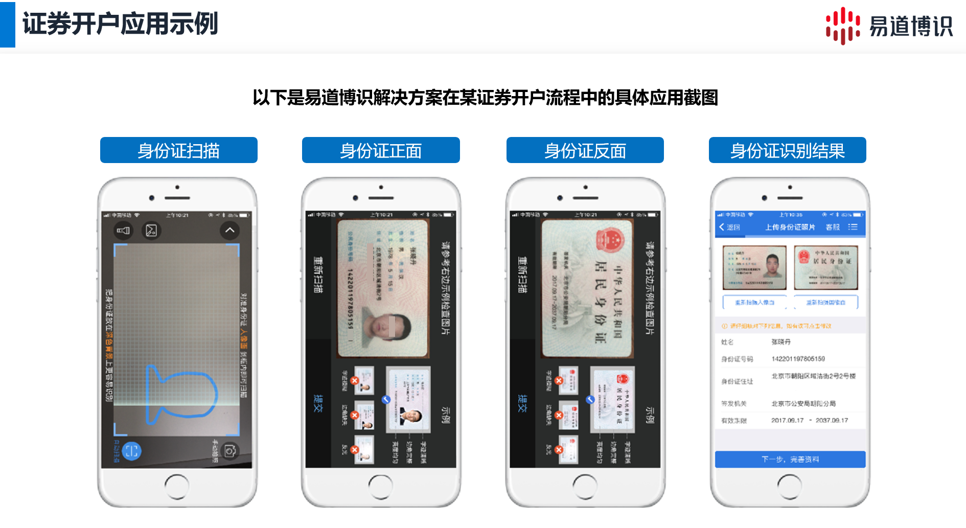 在線證券開戶已經(jīng)成為證券行業(yè)發(fā)展的必然趨勢。而易道博識的智能化開戶解決方案,融合了身份證識別技術(shù)與活體檢測技術(shù),已經(jīng)為越來越多的證券行業(yè)開戶流程提供了強有力的安全保障和技術(shù)支撐,助力其實現(xiàn)更加穩(wěn)健、高效的數(shù)字化轉(zhuǎn)型。