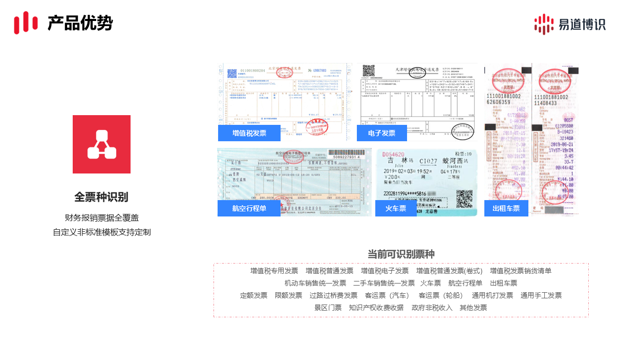 易道博識的發票識別方案不僅能夠完成常規的發票信息OCR識別,還支持發票混貼識別和發票真偽核驗功能。