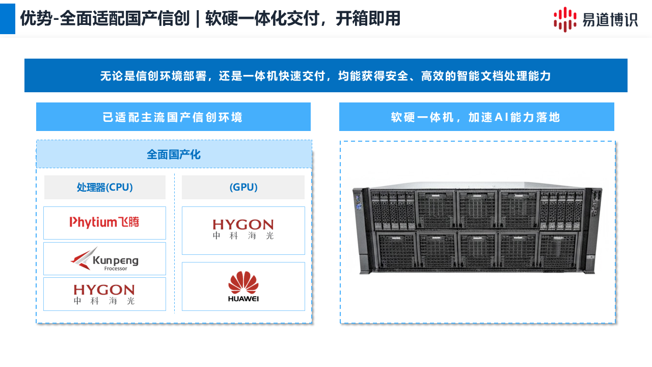 易道博識GIE大模型已全面適配主流國產(chǎn)化軟硬件環(huán)境。它能夠穩(wěn)定運行在鯤鵬、飛騰、海光、龍芯等國產(chǎn)CPU,以及統(tǒng)信UOS、麒麟軟件等國產(chǎn)操作系統(tǒng)平臺上。