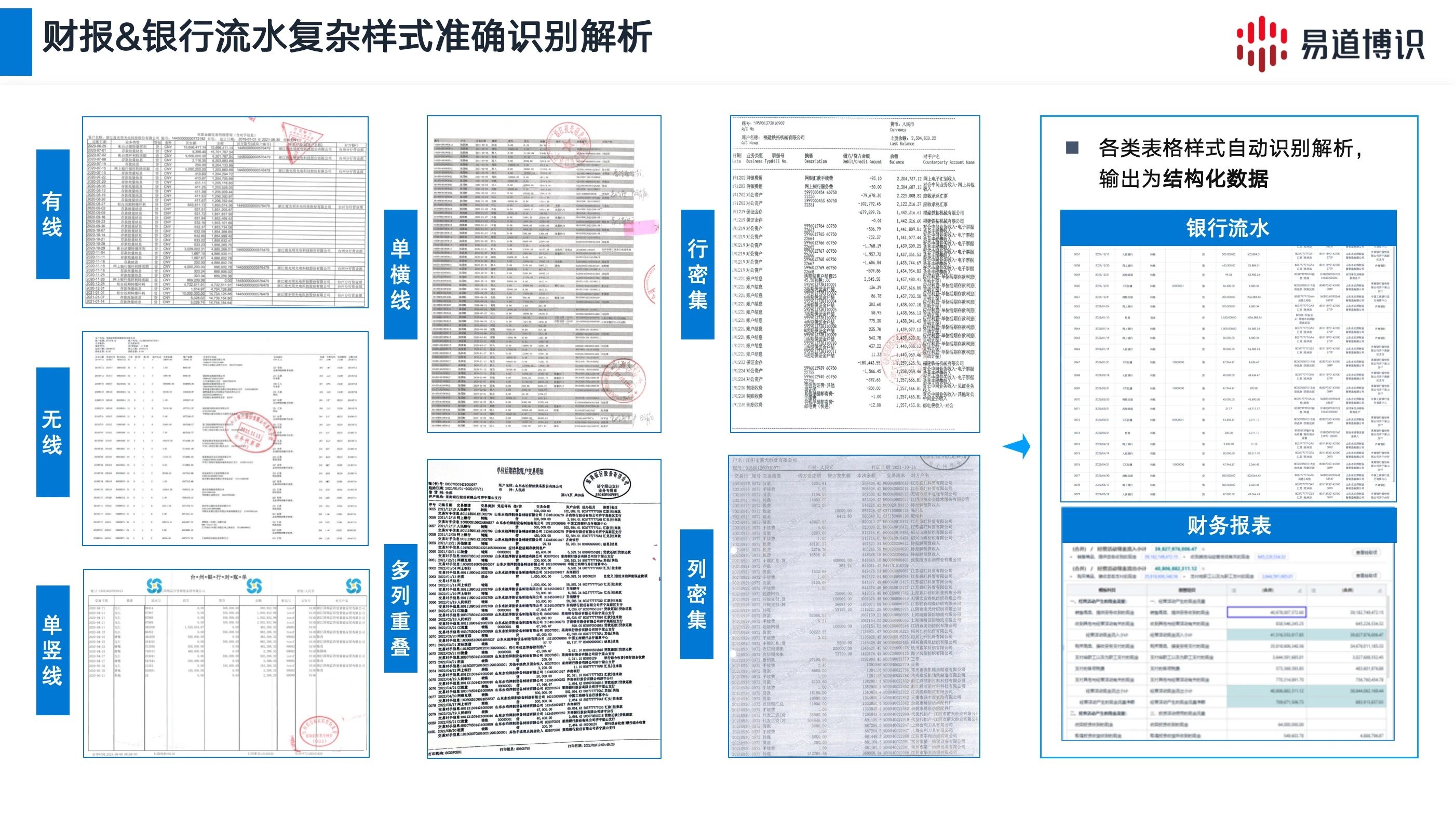 財報識別錄入與銀行流水分析:當投顧需要為高凈值客戶或企業客戶提供資產配置建議時,快速、準確地分析其財務狀況是基礎。易道博識的財報&銀行流水集成方案,能將非結構化的財報、銀行流水等文件,迅速轉化為結構化的數據,幫助投顧高效完成客戶畫像與風險評估,為提供千人千面的定制化服務打下堅實的數據地基。