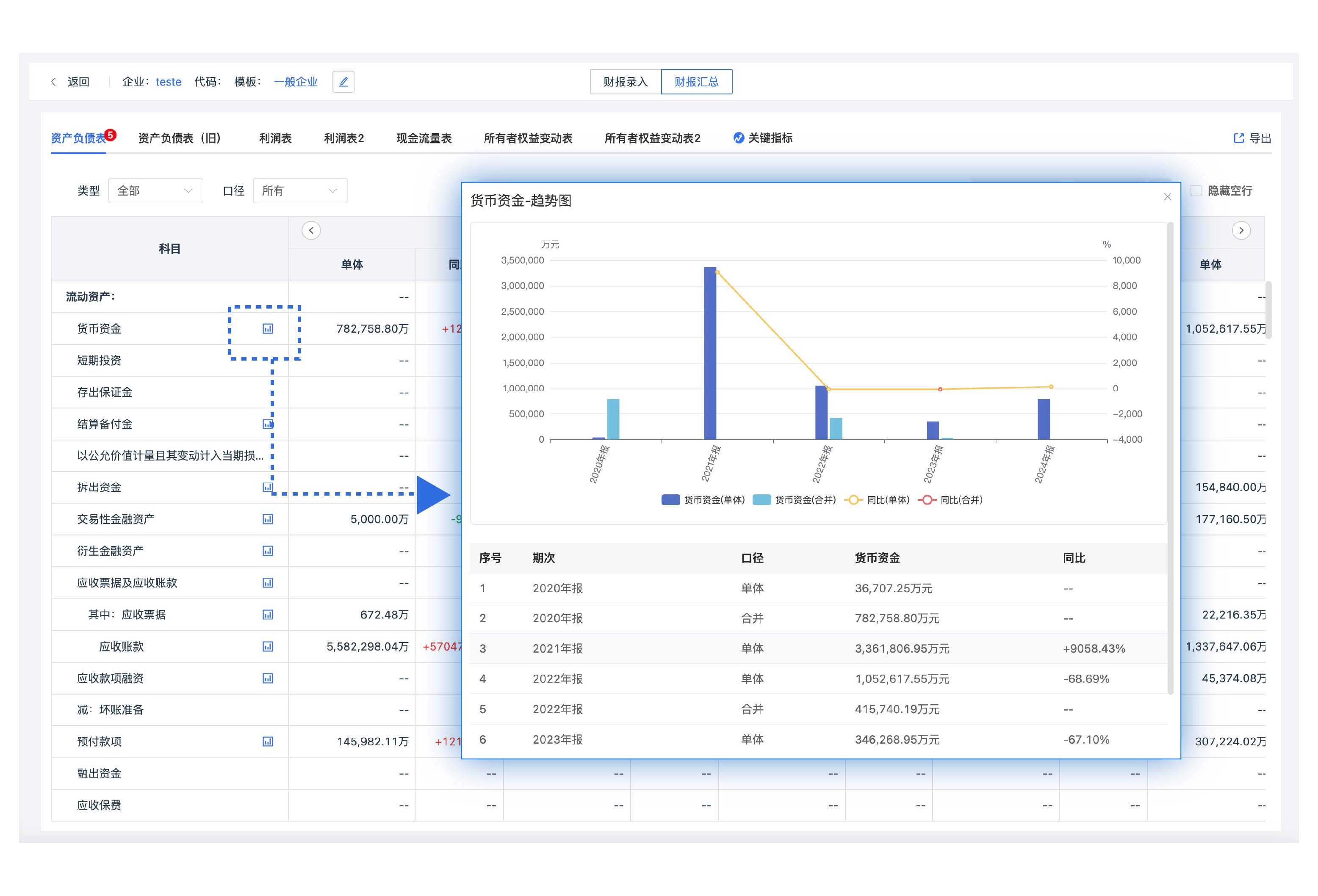 ● 智能分析與報告生成:系統(tǒng)不僅能自動提取三大表數(shù)據(jù),還能進行多維度的財務(wù)指標分析,對企業(yè)的盈利、償債、營運及發(fā)展能力進行全景式健康診斷。此外,它還能將復(fù)雜的財務(wù)數(shù)據(jù)轉(zhuǎn)化為直觀圖表,并一鍵生成可導(dǎo)出的財務(wù)分析報告。