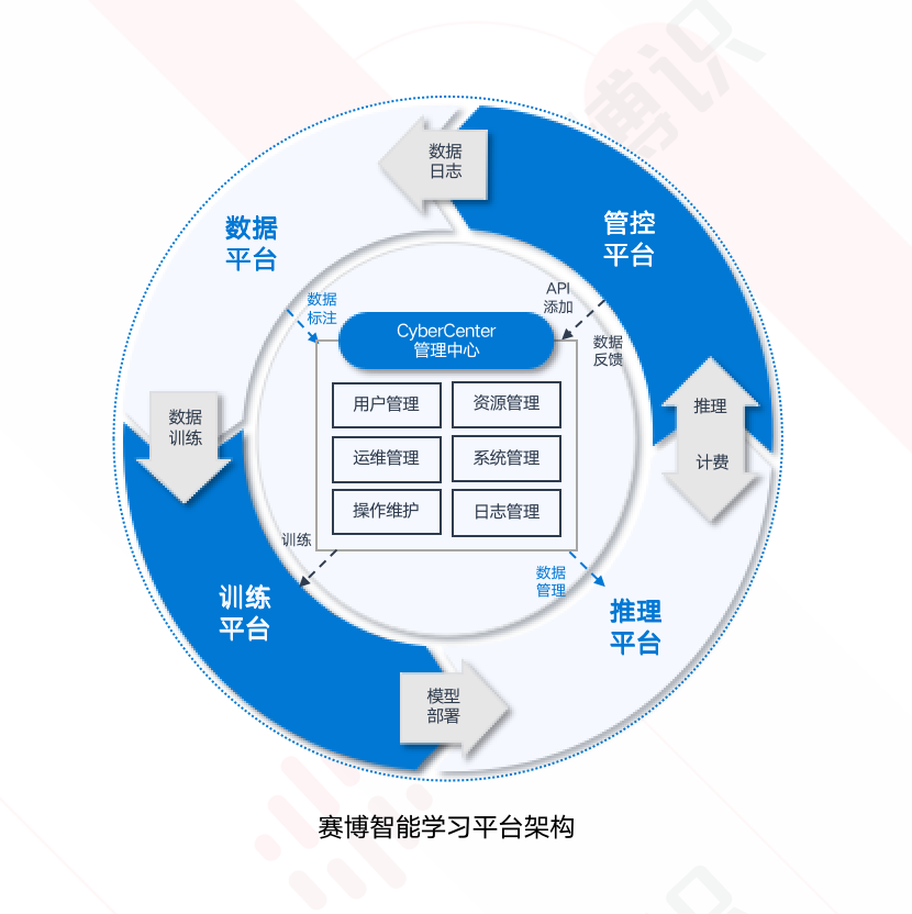 產品組成上,賽博智能學習平臺由管理中心、數據標注平臺、深度學習訓練平臺和深度學習推理平臺幾個子平臺組成,各子平臺依次承擔平臺管理、數據管理與標注、模型訓練和模型服務的功能,各個子平臺之間相互獨立又有效配合,形成一個有機整體,從而有效支撐數據驅動模型應用的整體功能。