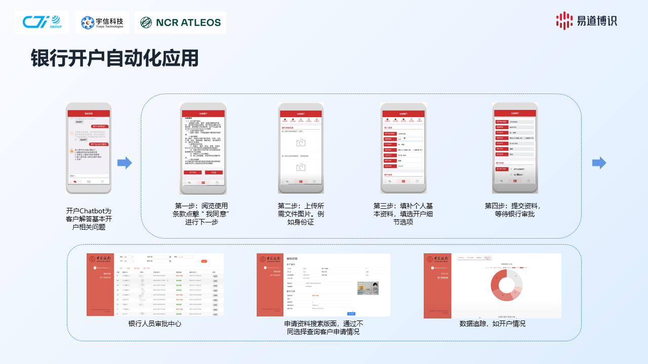 銀行開戶:傳統(tǒng)的銀行開戶流程通常繁瑣且時間消耗較大,無法滿足現(xiàn)代客戶對即時、便捷服務的渴望。在自動化流程上,一方面,機器人可對C端客戶問題做基本解答,并對客戶開戶流程做引導。另一方面,銀行需要對客戶提交資料進行校驗。整個過程中的證件資料和人臉識別等都可以借助易道博識智能產品進行智能識別,簡化開戶流程,加速審批過程,并確保符合合規(guī)標準。