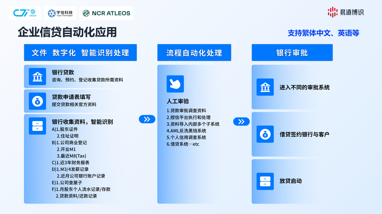 企業(yè)信貸:企業(yè)貸款流程提交的資料,除了股東證件、地址證明、商業(yè)登記等,還有企業(yè)財報,如資產負債表、現(xiàn)金流量表、利潤表等,資料多且繁雜。通過智能識別,可以把以上資料快速的電子化、數(shù)字化,人工審核變?yōu)樽詣訉徍耍鹑跈C構可以更迅速地評估企業(yè)的信用風險,為中小企業(yè)提供更快速的融資支持,同時降低信貸過程中的操作風險。