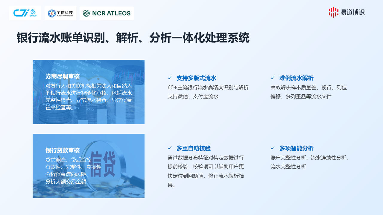 財報流水:企業(yè)IPO過程中,股東提供的個人銀行流水超百頁,都需要手工錄入系統(tǒng);車貸、房貸等業(yè)務中,也需要提供銀行流水。然而,由于國有行、大型股份制銀行、中小城商行均有專屬模板,存在銀行流水種類各易,版式不一等問題。借助易道博識智能識別產品,企業(yè)能夠加速財報生成和流水整理,減輕財務團隊的工作負擔,同時確保財務數(shù)據的準確性和及時性。