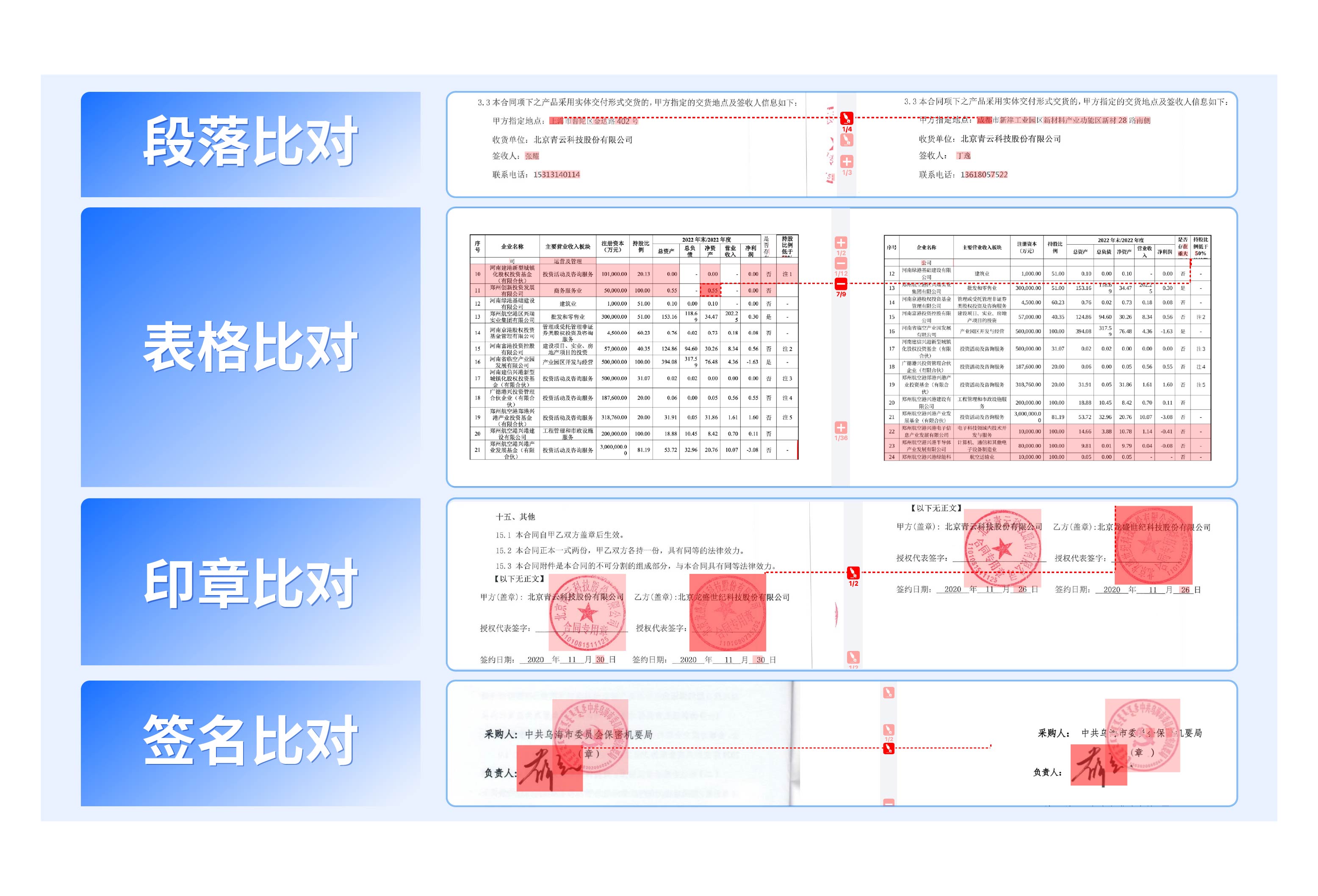支持段落、大綱、表格、印章等信息比對,可精確至標點符號