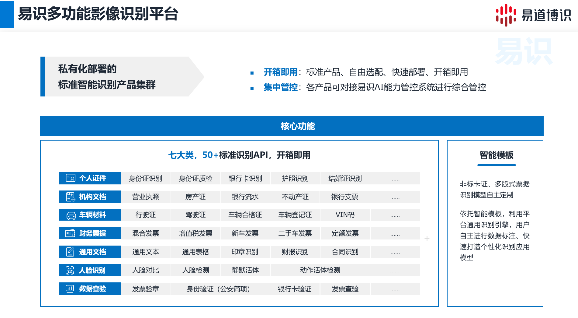 營業(yè)執(zhí)照OCR識(shí)別技術(shù)的出現(xiàn),標(biāo)志著機(jī)構(gòu)開戶流程進(jìn)入了一個(gè)全新的高效時(shí)代。易道博識(shí)的“易識(shí)”產(chǎn)品線基于深度學(xué)習(xí)技術(shù),提供了強(qiáng)大的OCR識(shí)別功能,涵蓋了營業(yè)執(zhí)照、身份證等多種證件識(shí)別,包含7大類、50+標(biāo)準(zhǔn)卡證識(shí)別,滿足市場主流OCR識(shí)別需求,極大地提升了識(shí)別效率和準(zhǔn)確性。特別是“易識(shí)AI能力開放平臺(tái)”支持多種卡證識(shí)別功能,用戶可以通過調(diào)用API接口,輕松實(shí)現(xiàn)證件信息的提取與處理。同時(shí),“易識(shí)移動(dòng)端識(shí)別SDK”在移動(dòng)端也能提供與服務(wù)器端相當(dāng)?shù)淖R(shí)別性能,特別適合遠(yuǎn)程開戶和移動(dòng)支付等場景。