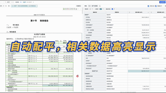 在智能解析的基礎上,系統可以自動完成財報數據配平與校驗,基于財務科目間勾稽關系輔助核算,自動校驗,對相關數據高亮顯示,科目數值可相互定位對照顯示,方便手動修正,進一步提升識別準確率。