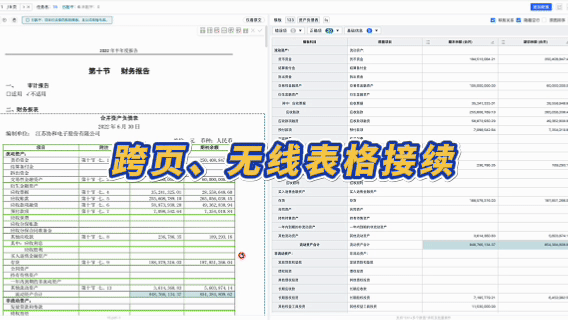 特別是在處理跨頁表格、無線表格等復雜文檔時,智能財報錄入系統能夠有效識別表格中的邏輯結構,即使缺乏明顯的分隔線,也能自動連接跨頁內容確保跨頁內容的完整性和準確性。