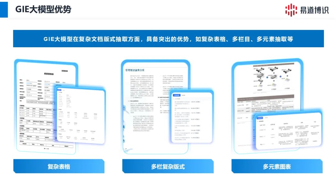 而隨著以Transformer架構(gòu)為代表的大模型的興起,文檔處理也迎來了新的發(fā)展機(jī)遇。大模型技術(shù)憑借其強(qiáng)大的語義理解能力、跨模態(tài)學(xué)習(xí)能力和泛化能力,能夠有效克服傳統(tǒng)OCR技術(shù)的局限性,實(shí)現(xiàn)對(duì)各種復(fù)雜場景文檔的高精度、高效率識(shí)別和處理。易道博識(shí)正是敏銳地洞察到了大模型在文檔智能領(lǐng)域的巨大潛力,推出了GIE大模型(OCR大模型)。