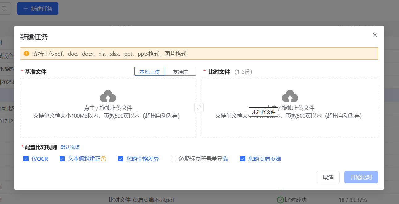 ●靈活的比對模式: 支持多任務并行,可同時上傳多個文檔與一個基準文件進行比對,并能自定義比對規則(如忽略標點、空格差異)。