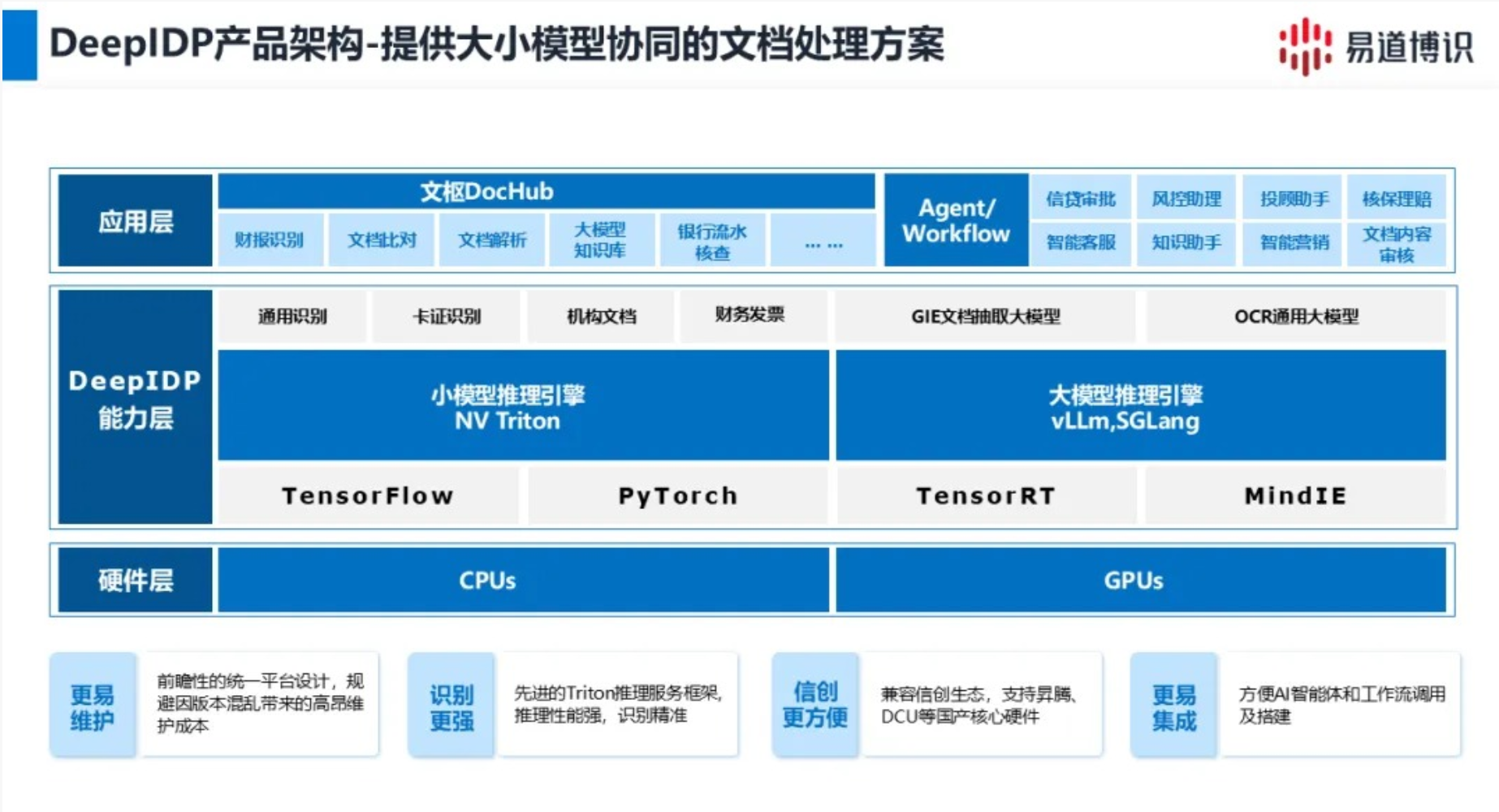 DeepIDP在底層集成了小模型推理引擎和大型模型推理引擎。該架構可以根據任務的復雜度和需求,自動調度最合適的模型進行處理,對外提供標準化的服務接口。