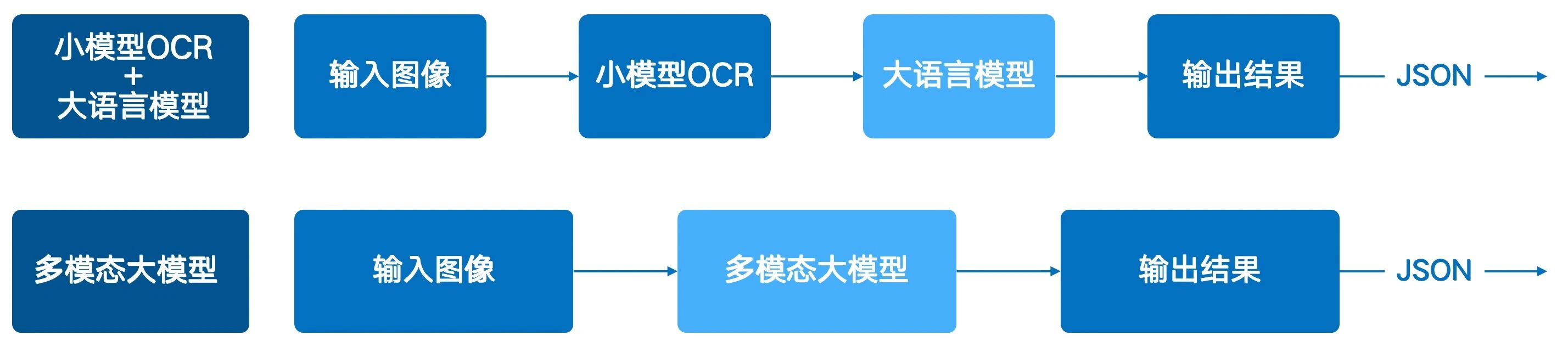 多模態大模型:多模態大模型是“圖像輸入→文本輸出” 的端到端解決方案。模型通過統一的架構直接理解圖像中的視覺特征(如文字、布局)和語義信息,一步完成識別與信息提取。